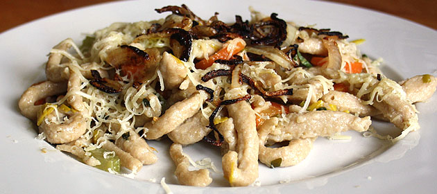 Quark Pizokel schnelles Familien. Mehl Milch und Eier zu einem glatten Teig verrühren. Pizokel sind eine an Spätzle erinnernde Teigwarenspezialität aus Graubünden.